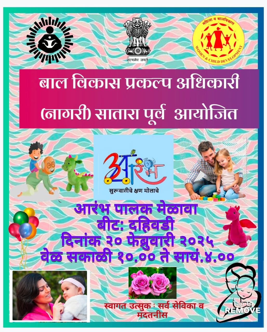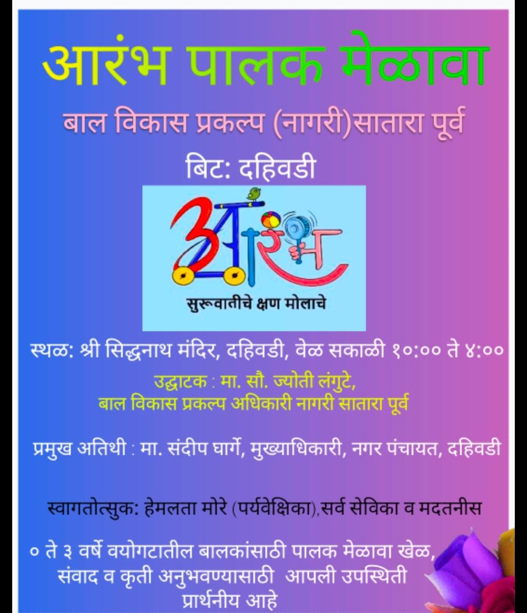 या पार्श्वभूमीला अनुसरून; महाराष्ट्र शासन बालविकास प्रकल्प अधिकारी नागरी सातारा पूर्व प्रकल्प यांचे कडून सातारा जिल्ह्यातील माण तालुक्यातील, दहिवडी बीट मार्फत उद्या गुरुवार दि. २० फेब्रुवारी रोजी दहिवडी नगरीचे ग्रामदैवत श्री सिद्धनाथ मंदिर व परिसर, या ठिकाणी सकाळी १० ते सायंकाळी ४ या वेळेत आरंभ पालक मेळाव्याचे आयोजन करण्यात आले आहे.