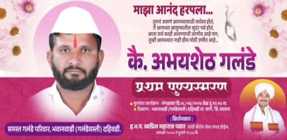 माण तालुक्यातील स्व.अभय मारुती गलंडे हे दहिवडी येथील माजी. ग्रामपंचायत सदस्य, दहिवडी विकास सेवा सोसायटीचे माजी चेअरमन व नगरपंचायत दहिवडीचे माजी नगरसेवक मारुती गलंडे उर्फ दादा यांचे ज्येष्ठ चिरंजीव होत. मागील वर्षी दि. १९ एप्रिल २०२४ रोजी स्व.अभयशेठ गलंडे यांचे आकस्मित दुःखद निधन झाले. त्यांचा प्रथम पुण्यस्मरण दिन मंगळवार दि. ८ एप्रिल २०२५ रोजी आहे.यानिमित्ताने दहिवडी येथील भावनवाडी येथे ह भ प स्वप्निल महाराज पवार यांचे किर्तन सकाळी १० ते दुपारी १२ या वेळेत होणार आहे आणि पुष्पवृष्टी दुपारी १२ वाजून ५ मिनिटे वाजता आहे.