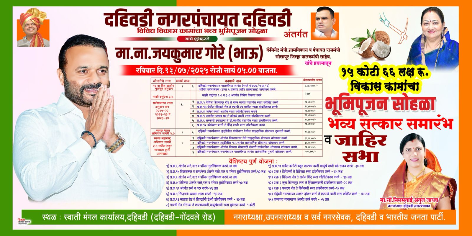 ग्रामविकास व पंचायत राज कॅबिनेट मंत्री तथा सोलापूर जिल्हा पालकमंत्री जयकुमार गोरे यांच्या हस्ते सातारा जिल्ह्यातील, माण तालुक्याचे मुख्यालय असणाऱ्या दहिवडी शहरामध्ये १५ कोटी ६६ लाख रुपयांच्या विकास कामांचे भूमिपूजन रविवार १३ जुलै रोजी सायंकाळी ५ वाजता दहिवडीत करण्यात येणार आहे.