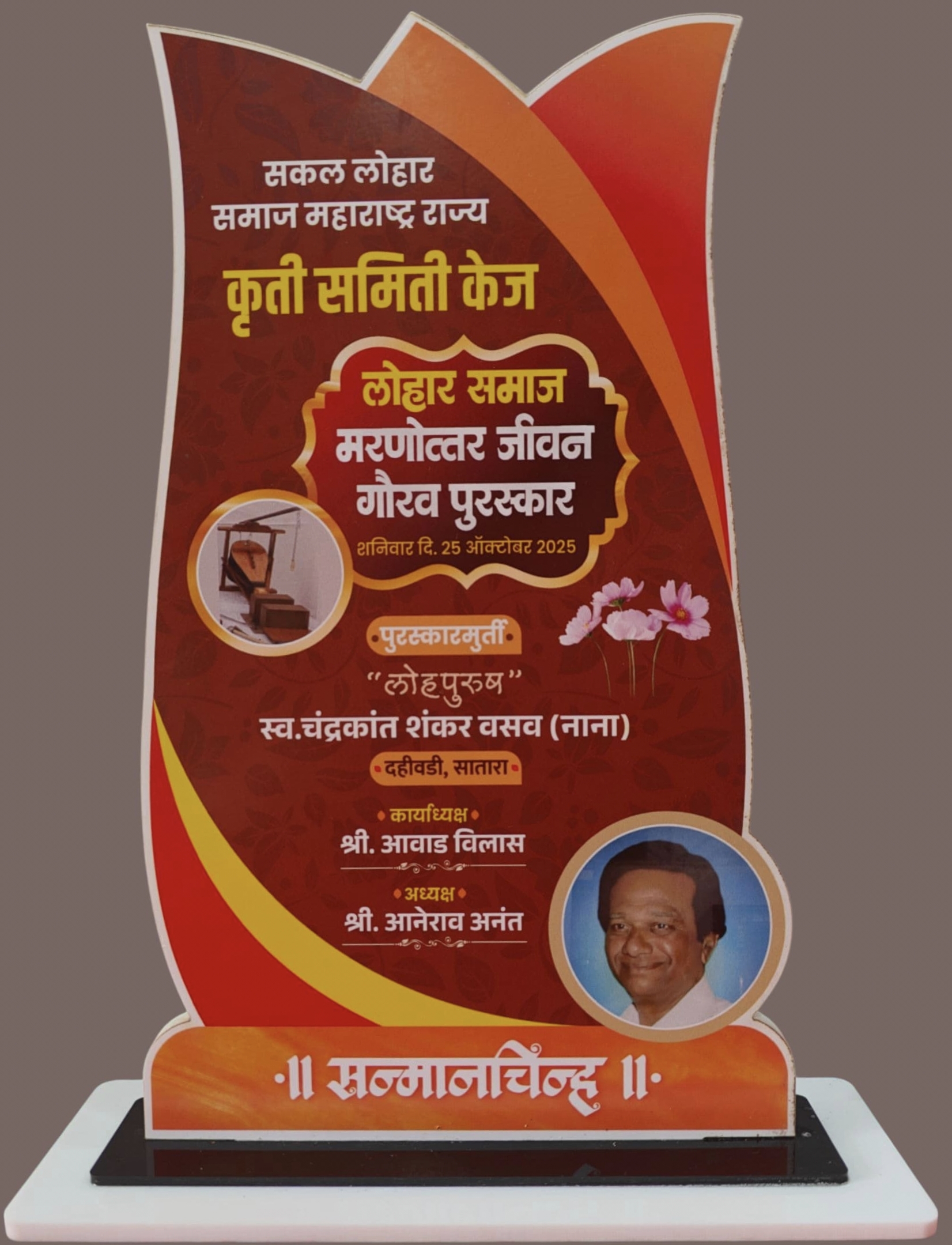 हा पुरस्कार राज्यस्तरीय लोहार समाजातील पदाधिकारी व इतर राज्यस्तरीय प्रमुख पाहुणे यांचे हस्ते प्रधान करण्यात आला. यावेळी तमाम महाराष्ट्रातील सकल लोहार समाज बांधव यांच्या उपस्थिती हा महामेळावा पार पडला.यावेळी त्यांचे कुटुंबीय यांनी हा पुरस्कार स्वीकारून त्याबाबत ॲड. महेश चंद्रकांत वसव,आर्किटेक्चर सिविल इंजिनियर प्रकाश वसव व त्यांचे कुटुंबीय यांनी आभार व्यक्त केले.