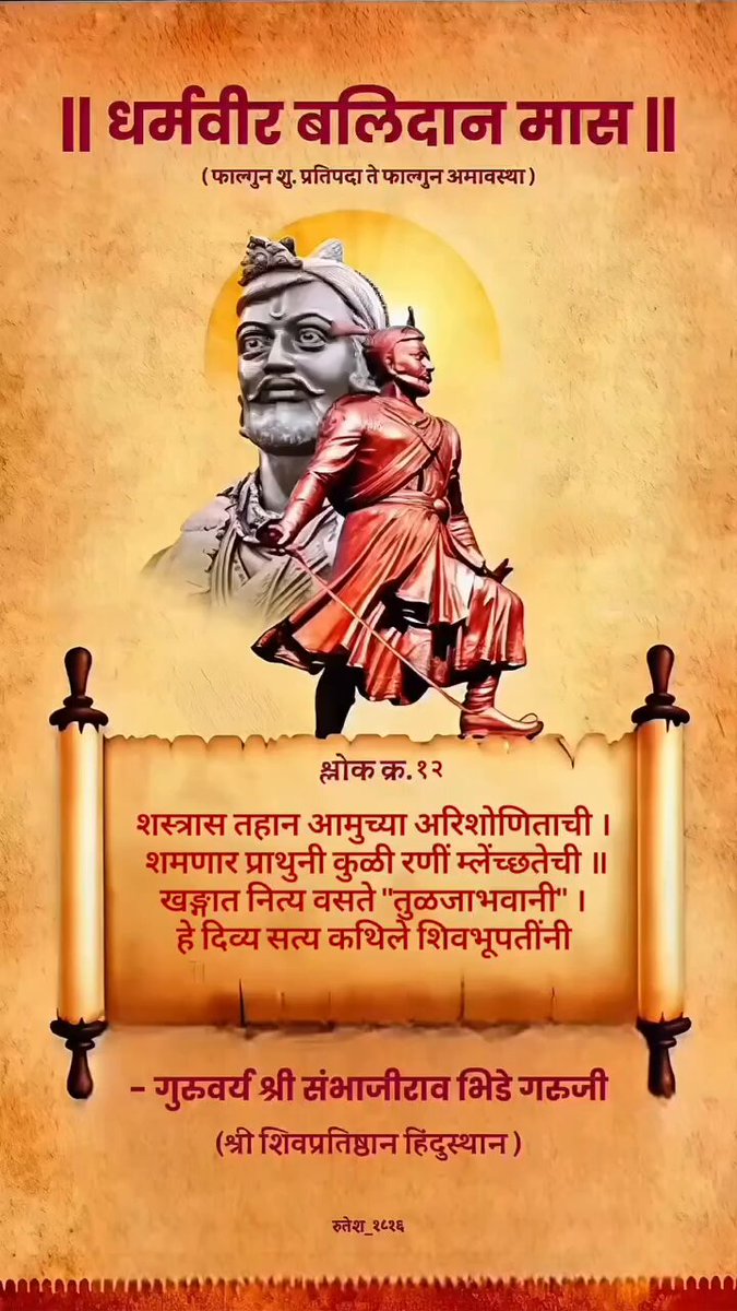 हिंदवी स्वराज्यासाठी प्रचंड झुंज देणारे हिंदवी स्वराज्याचे दुसरे छत्रपती संभाजी महाराज यांना औरंगजेब याने पकडले. त्यांचा पाशवी छळ करून त्यांचा रोज एक-एक अवयव संपूर्ण महिनाभर तोडत होते. अंगाची साल सोलून काढत होते. शेवटी फाल्गुन अमावस्येचे दिवशी पायापासून डोक्यापर्यंत देहाचे शस्त्राच्या साह्याने तुकडे तुकडे केले गेले. म्हणजेच श्री संभाजी महाराज मृत्यूच्या दिशेने,बलिदानाच्या मार्गावर,संपूर्ण महिनाभर, रोजच अति धीरोदात्तपणे, चालत होते. म्हणून त्यांना फाल्गुन शुद्ध प्रतिपदेपासून फाल्गुन अमावस्येपर्यंत रोजच सामाजिक व कौटुंबिक स्तरावर संपूर्ण महिनाभर प्रत्येक दिवशी श्रद्धांजली वाहून, “धर्मवीर बलिदान मास” पाळला जातो.