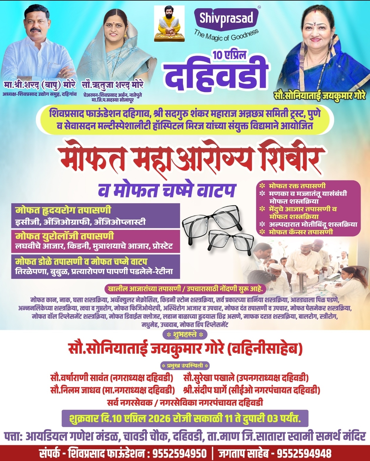 दहिवडी परिसरातील नागरिकांनी या सुवर्णसंधीचा लाभ घ्यावा, असे आवाहन शिवप्रसाद फाउंडेशन आणि आयोजकांच्या वतीने करण्यात आले आहे. अधिक माहितीसाठी ९५५२५९४९५० किंवा ९५५२५९४९४८ या क्रमांकावर संपर्क साधता येईल.